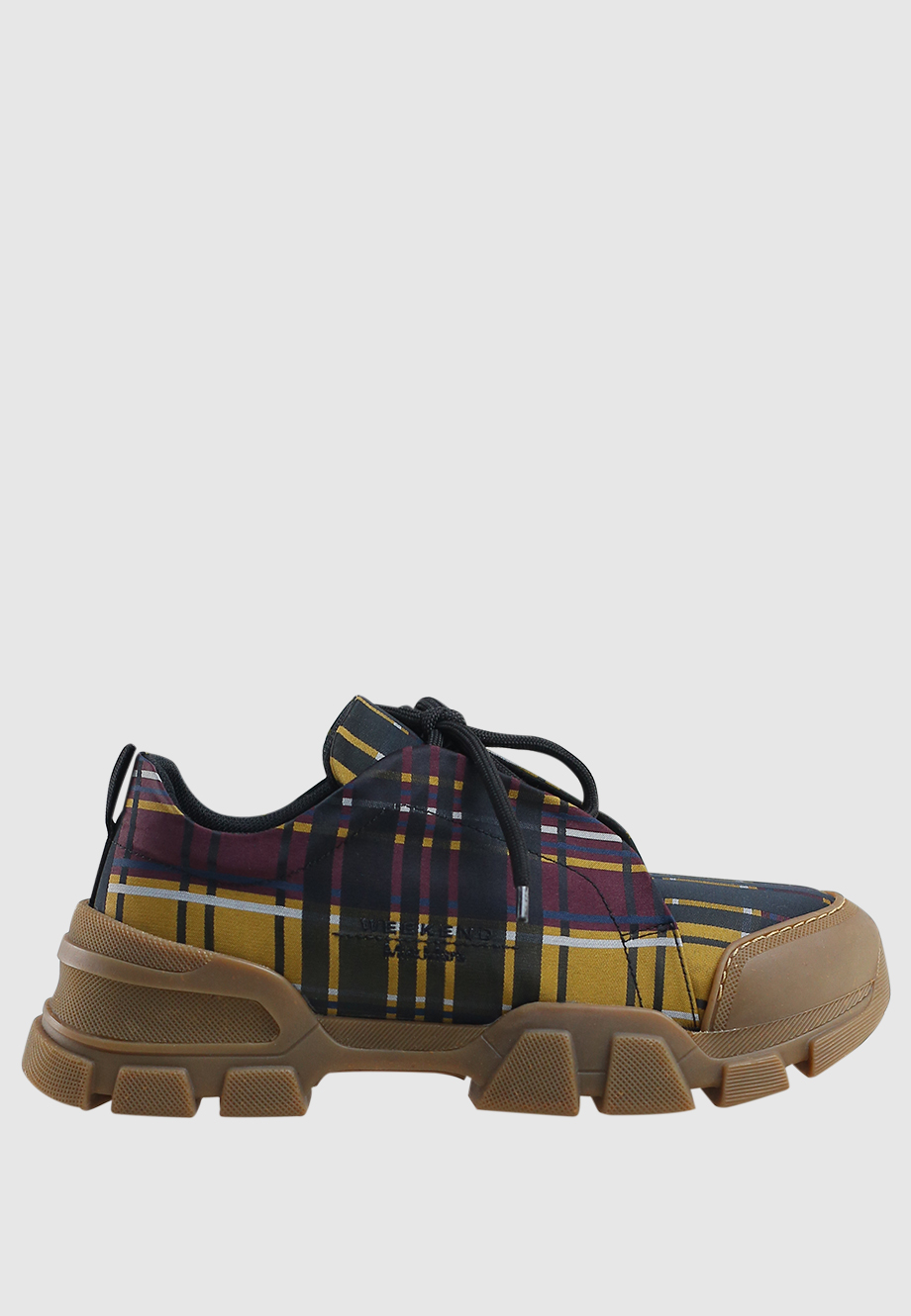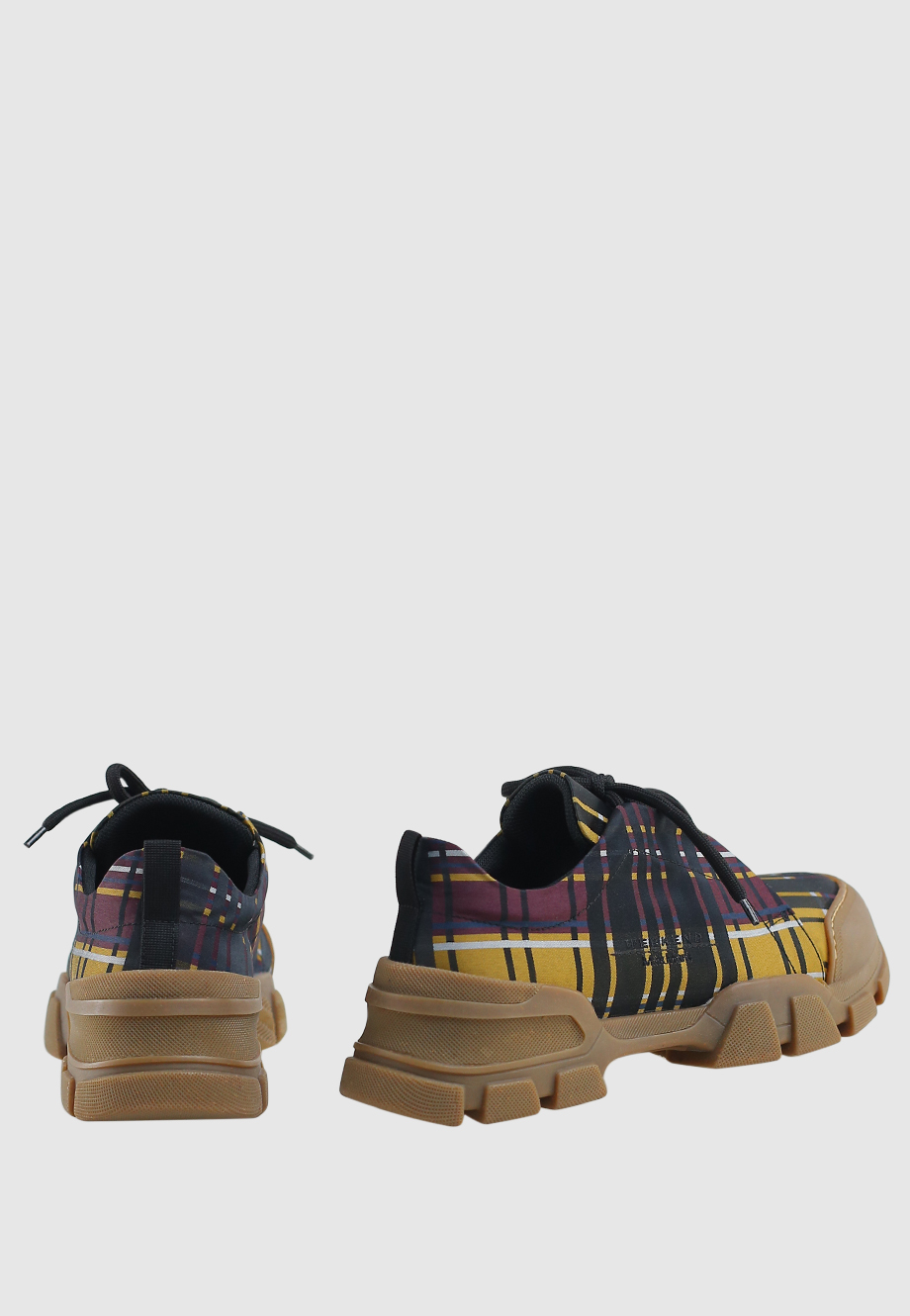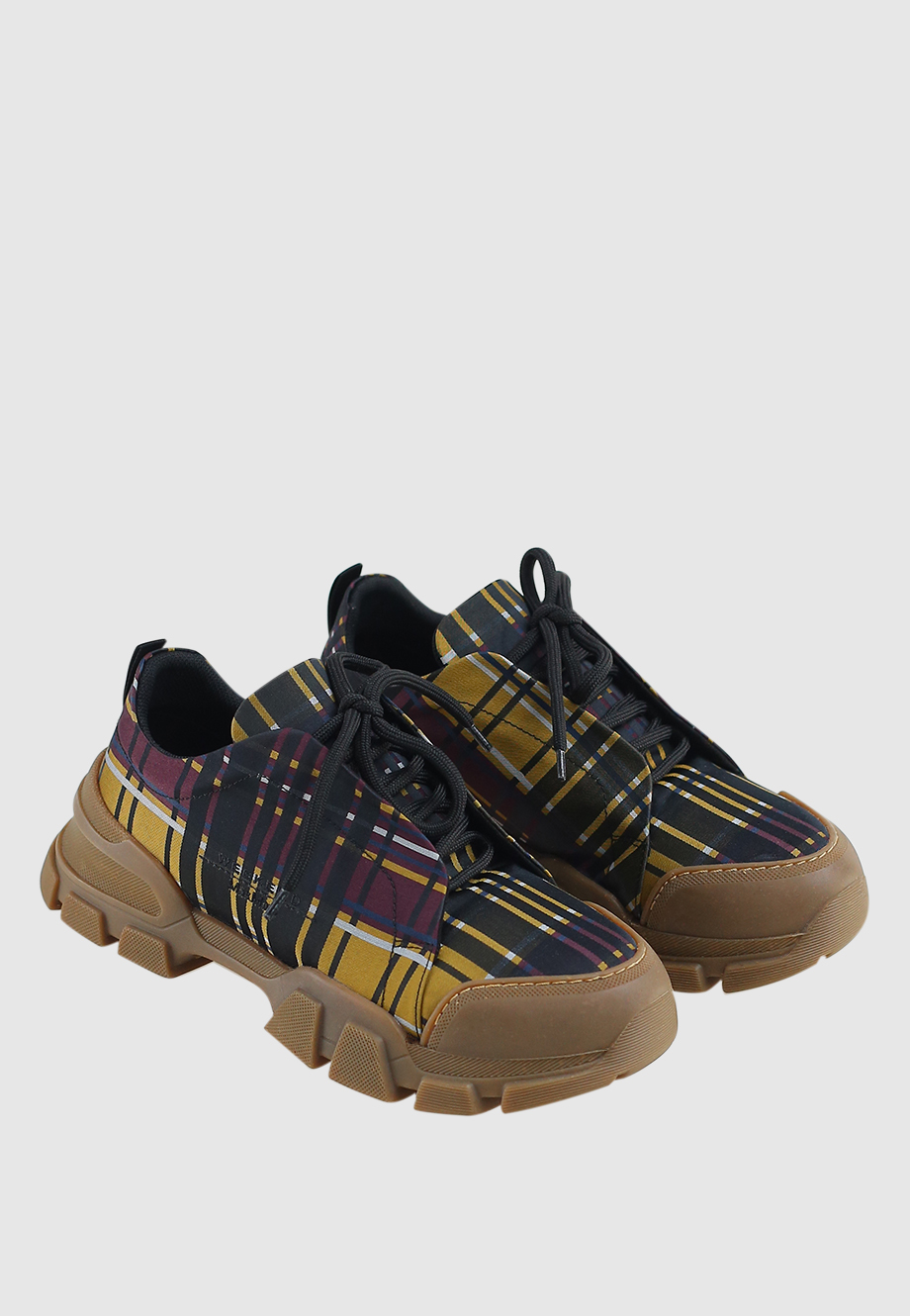 Массивная анатомическая подошва с литым мысом и кромкой, текстиль в клетку, шнуровка.
