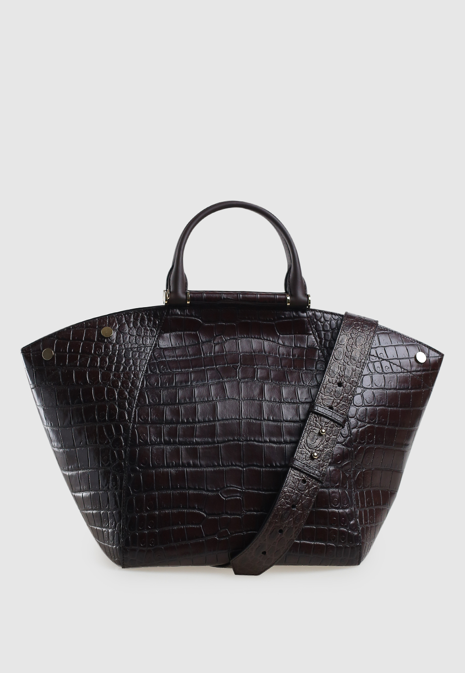 Трапециевидная форма, две ручки, регулируемый плечевой ремень, застёжка магнитными кнопками, тиснение идентичное узору крокодиловой кожи.