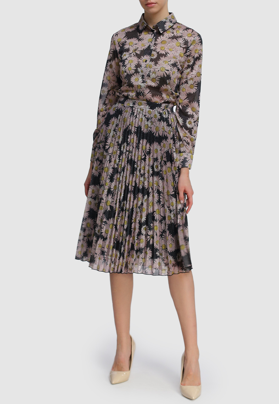 Прямой крой, отложной воротник, длинный втачной рукав с манжетой на пуговице, люрекс, цветочный принт, полупрозрачная фактура.