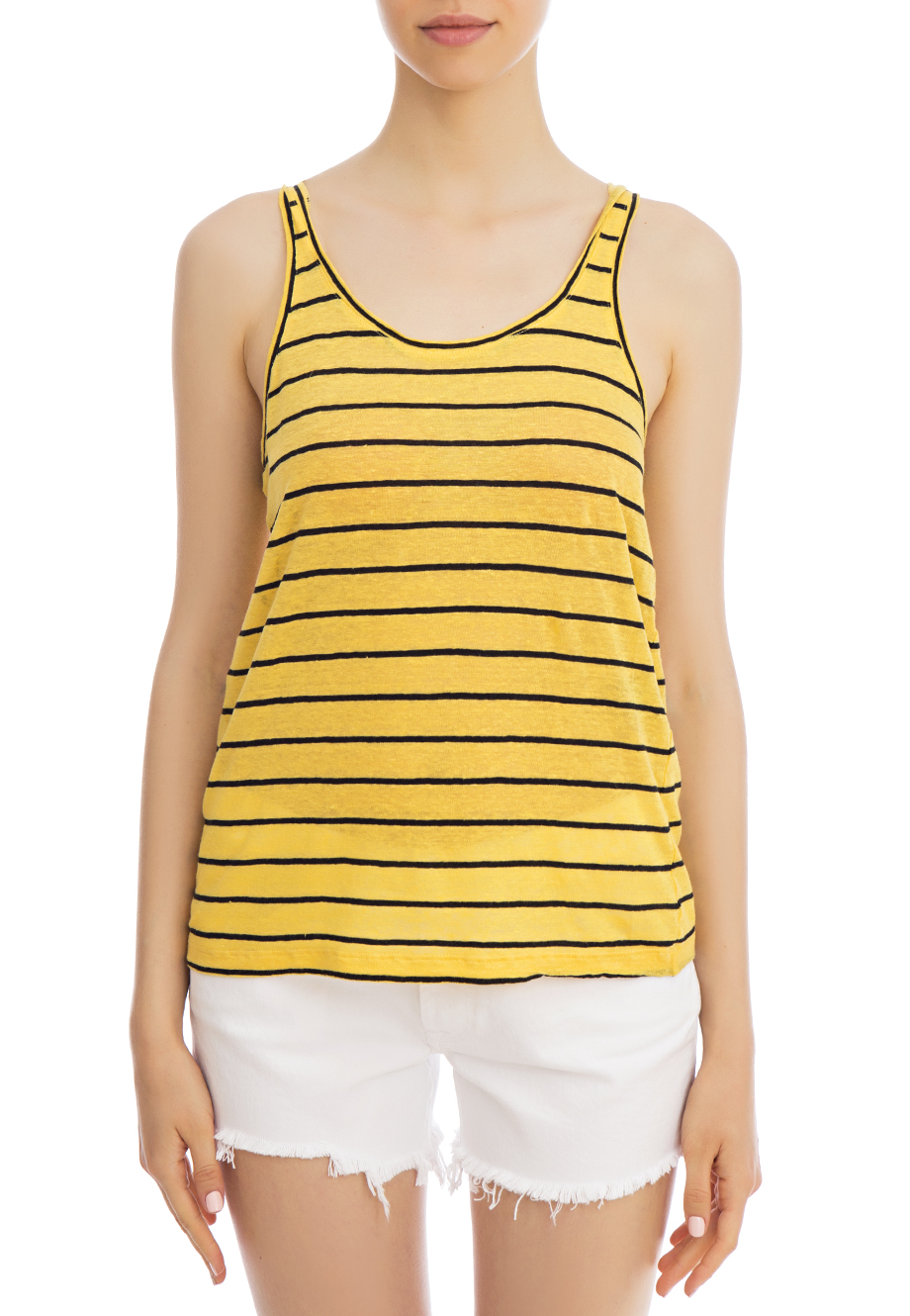 Детали: прямой крой, круглый вырез декольте, тонкие бретели, спортивная спинка, тонкий кант по краю проймы, неравномерная фактура ткани.