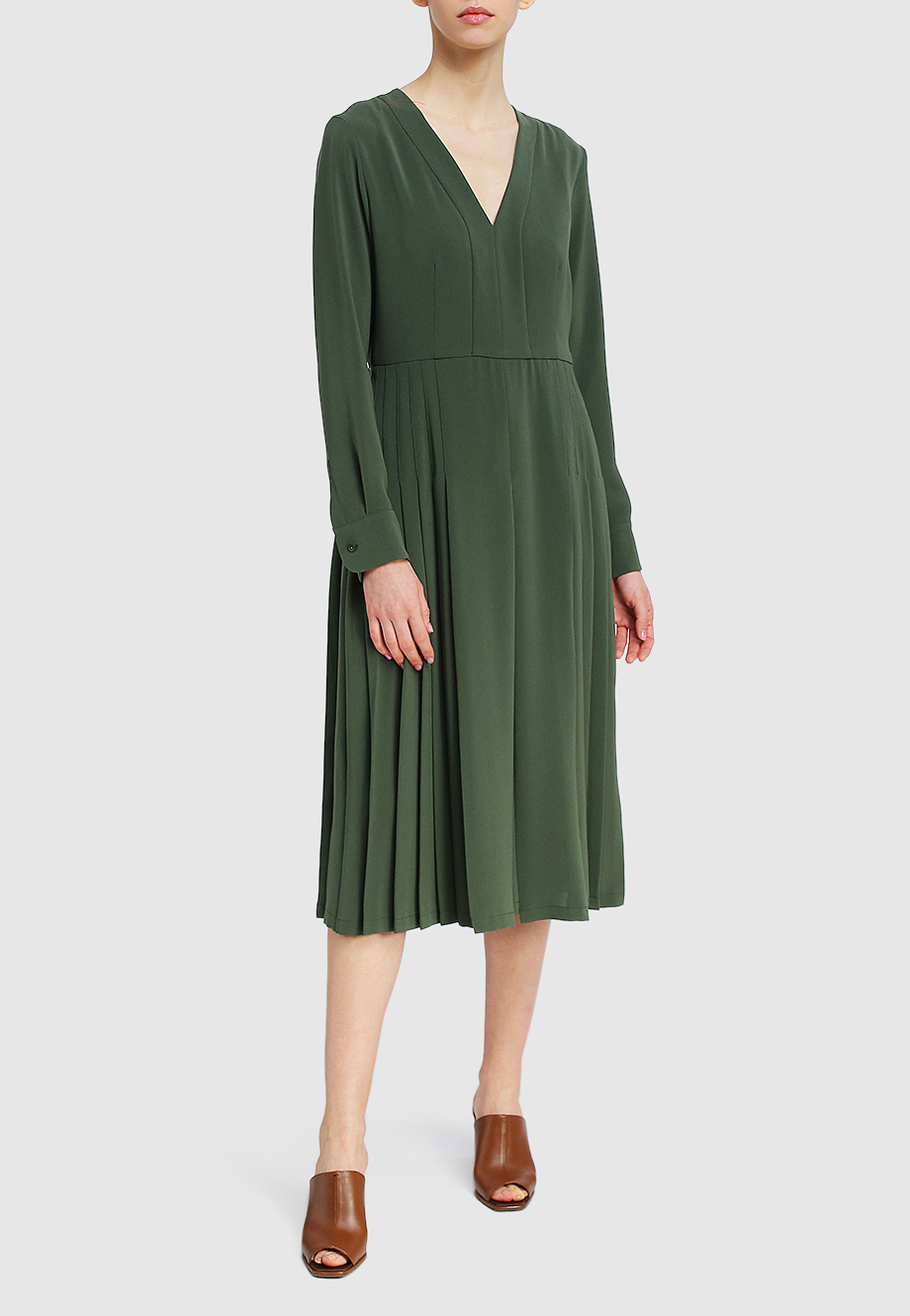 А-силуэт, V-образная линия декольте, длинный втачной рукав с манжетой на пуговице, отрезная линия талии, шорты с плиссировкой.