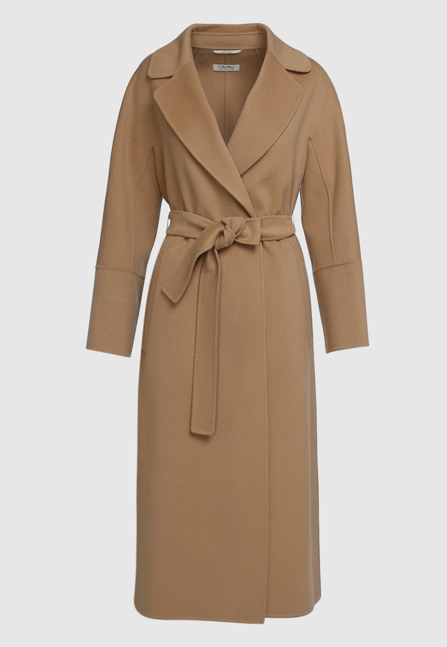 Традиционный крой под пояс, отложной воротник с лацканами, цельнокроеный длинный рукав, боковые карманы с рантом, пояс по линии талии, длина миди.