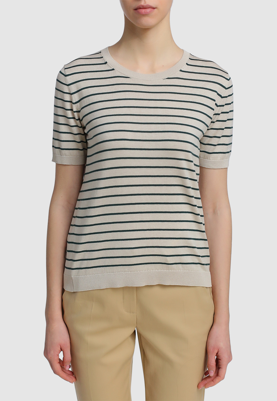 Прямой крой, круглый вырез горловины, короткий рукав, принт в полоску, манжеты по нижнему краю и на рукавах.