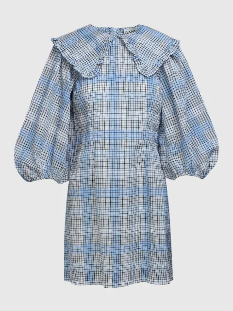 Приталенный крой, большой отложной воротник с оборкой, рукав длиной ¾, собранный манжетой, длина до середины бедра, принт в клетку.