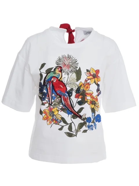 Детали: прямой крой, круглый вырез горловины, короткий втачной рукав, на груди принт и вышивка.