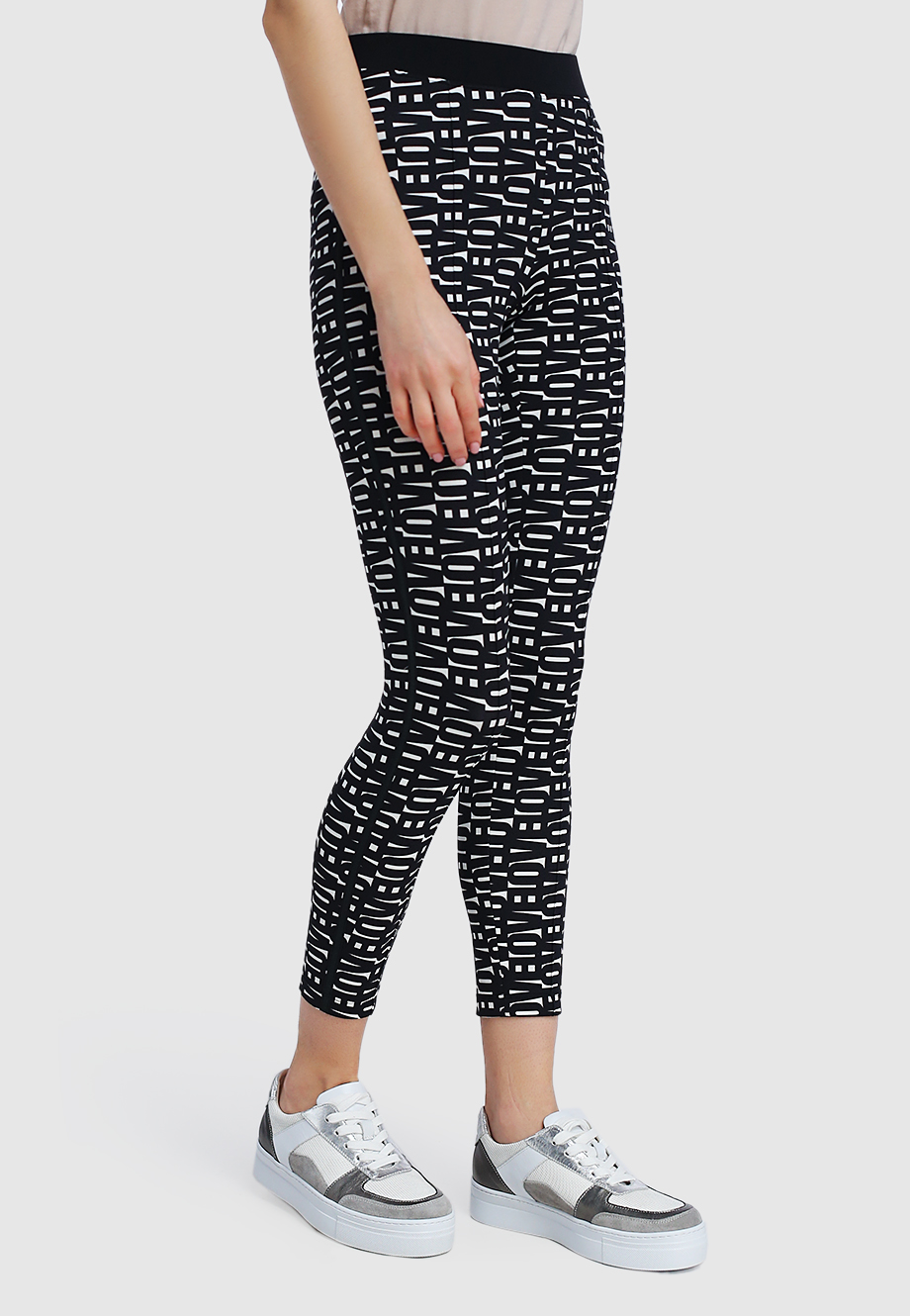Облегающий крой, высокая посадка, широкий эластичный пояс, монохромный принт.