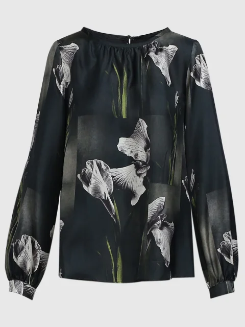 Прямой свободный крой, круглый вырез горловины со сборкой, каплей и пуговицей на спинке, длинный рукав реглан, собранный манжетой, цветочный принт.