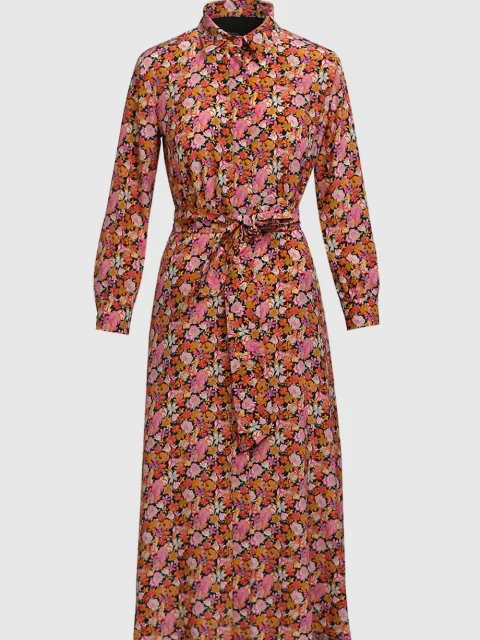 Крой под пояс, отложной воротник, планка с рядом пуговиц, длинный втачной рукав с манжетой на пуговице, пояс по линии талии, цветочный паттерн.