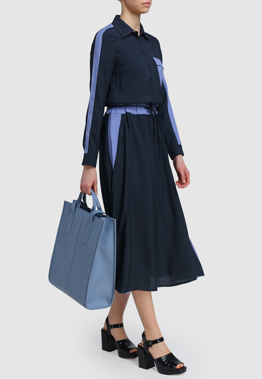 Прямоугольная форма, двойные ручки разной длины, одно отделение, перестрочки в тон.