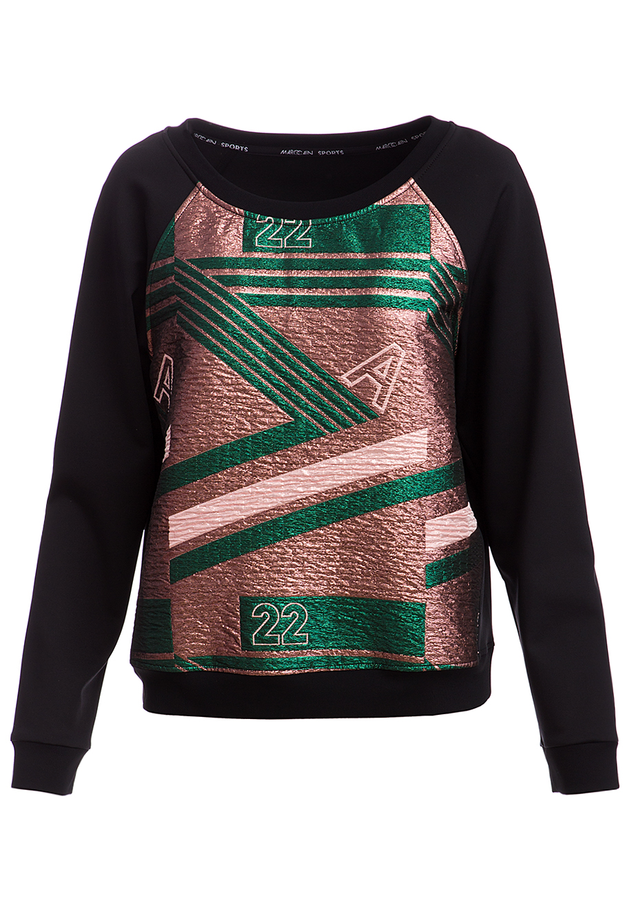 Детали: традиционный овальный крой, круглый вырез горловины, длинный рукав реглан с манжетой, передняя полочка из парчи с принтом, спинка и рукава из джерси, резинка по нижнему краю.