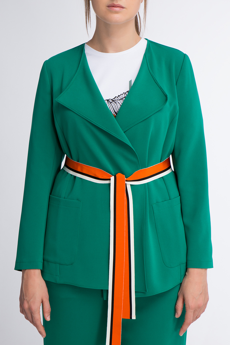 Детали: прямой крой под пояс, отложной воротник, длинный втачной рукав, накладные боковые карманы, контрастный цветной пояс по линии талии.