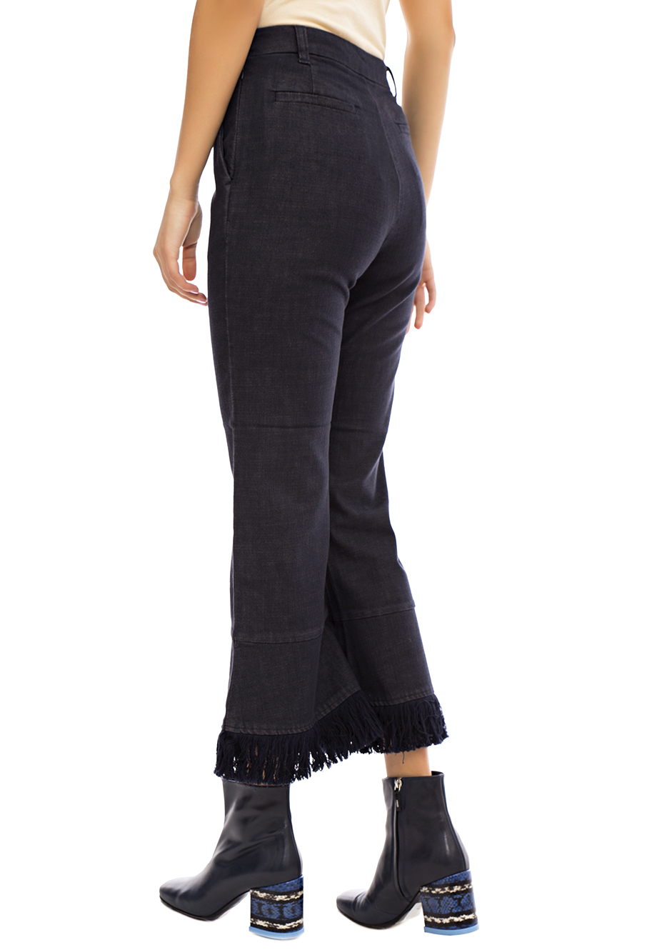 Детали: крой-клеш от колена, высокая посадка, французские боковые карманы, сзади прорезные с рантом, длинная бахрома по нижнему краю. Застегивается молнией на боковом шве.