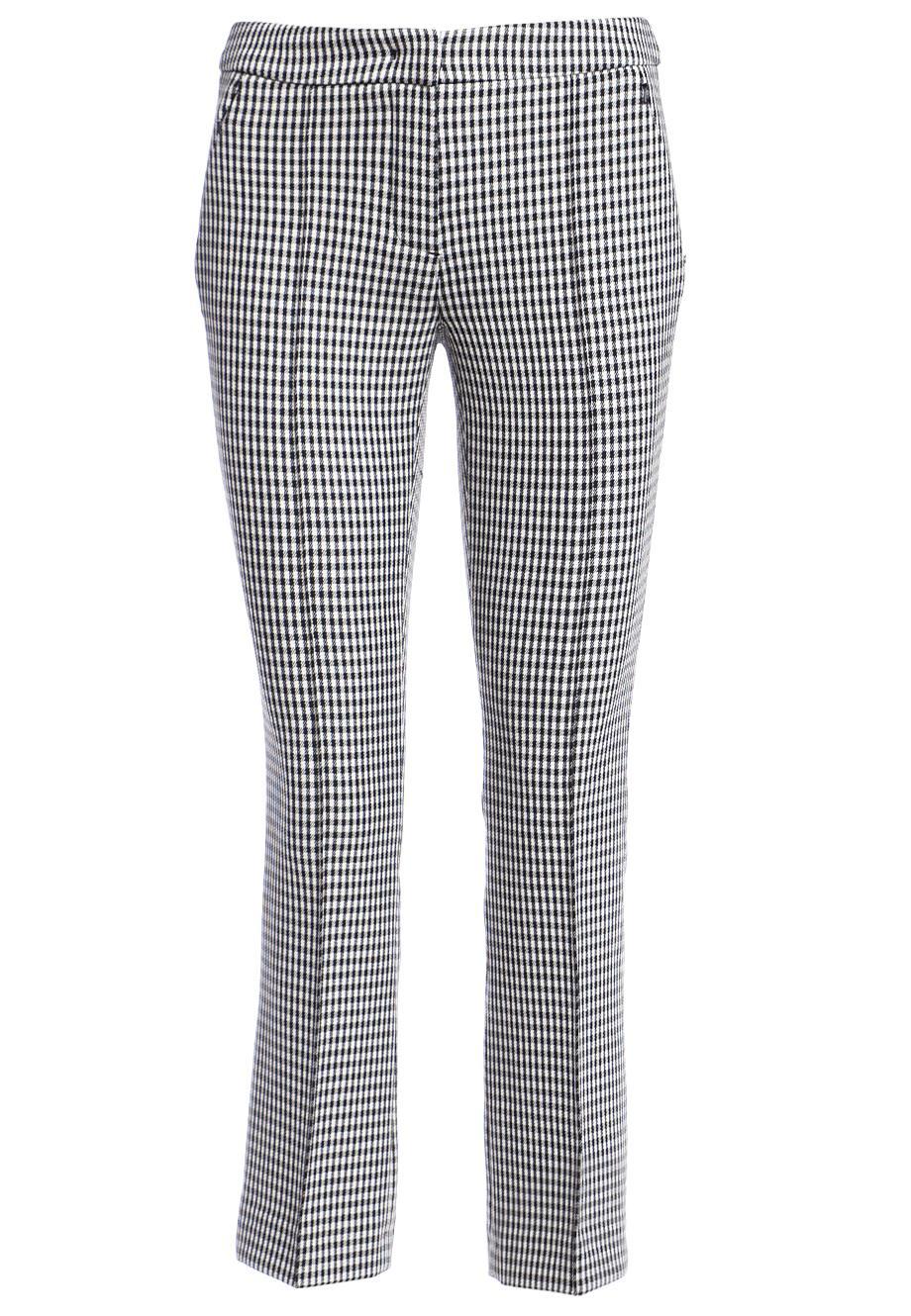 Детали: традиционный укороченный крой, средняя посадка, боковые карманы на потайных молниях, сзади два прорезных кармана с контрастным рантом, стрелки вдоль штанин, принт клетка «виши»