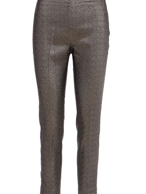 Детали: прямой укороченный крой, высокая посадка, металлизированная ткань, пояс с хлястиком на пуговице и молния по боковому шву. Стрелки вдоль штанин.