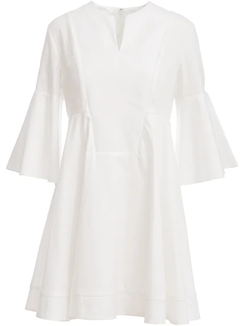 Детали: А-силуэт, кокетка под грудь, втачной двойной рукав длиной до локтя, круглый вырез горловины с мысом, юбка-полусолнце с крупными складками, широкий подгиб по подолу. Застегивается на спинке потайной молнией.