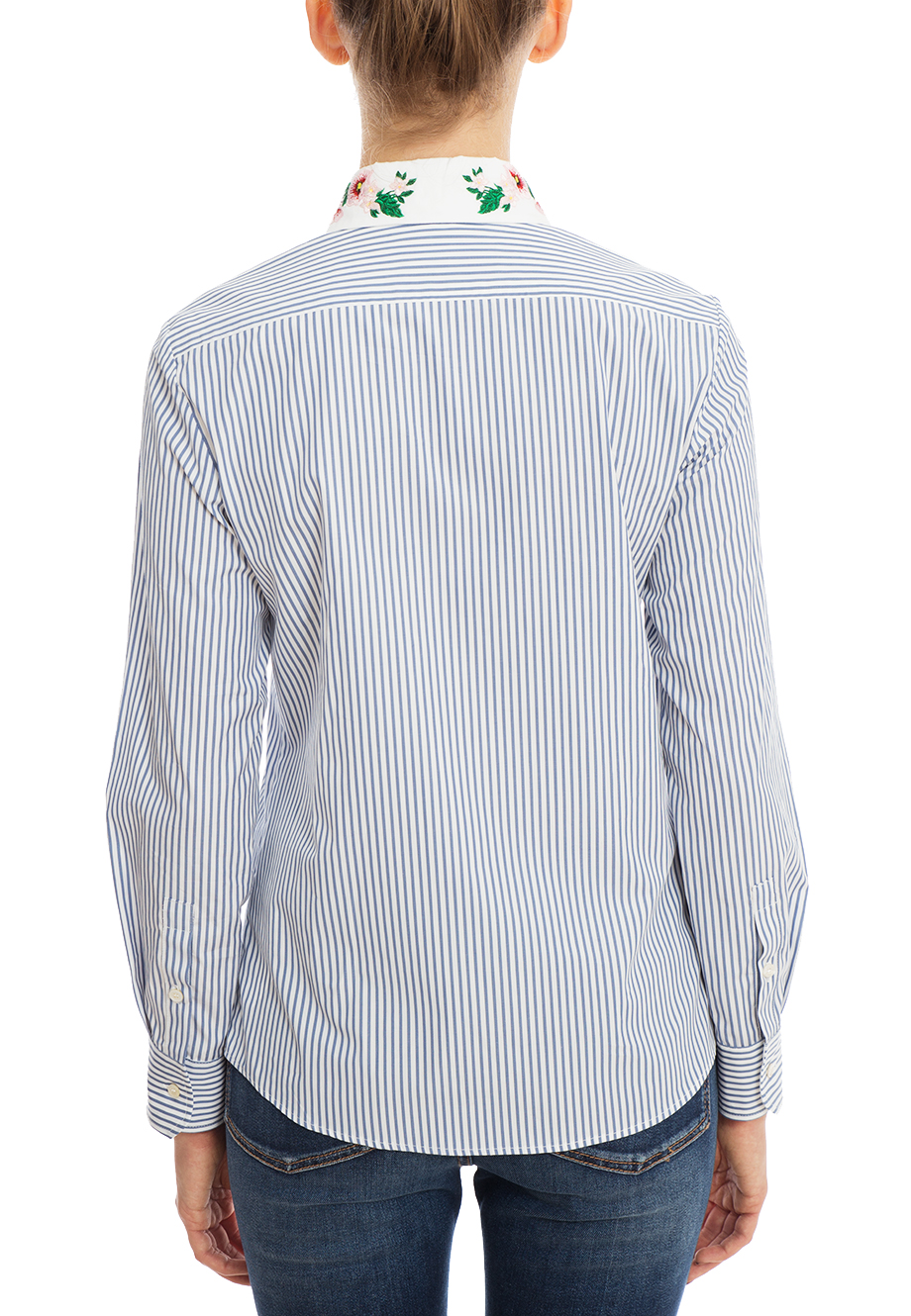 Детали: прямой крой, отложной воротник с вышивкой, планка с рядом скрытых пуговиц, накладной карман на груди.