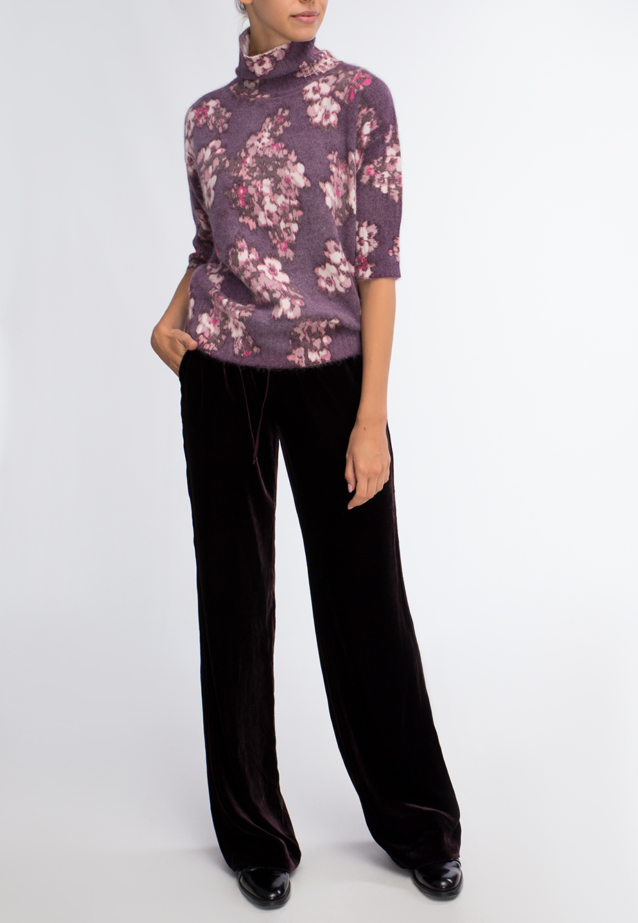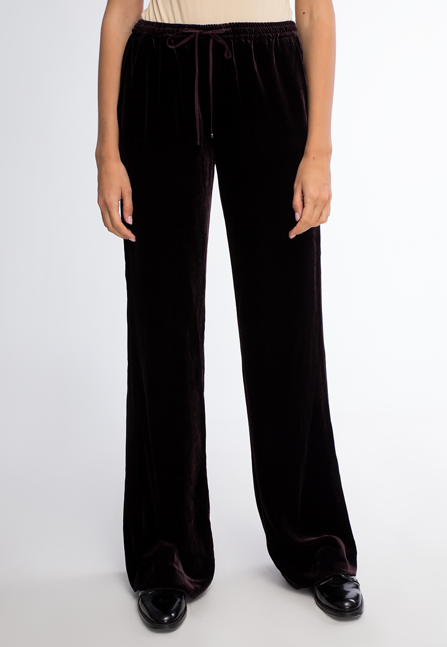 Детали: прямой свободный от бедра крой, высокая посадка, пояс на кулиске с резинкой и шнурком, прорезные карманы по боковым швам.