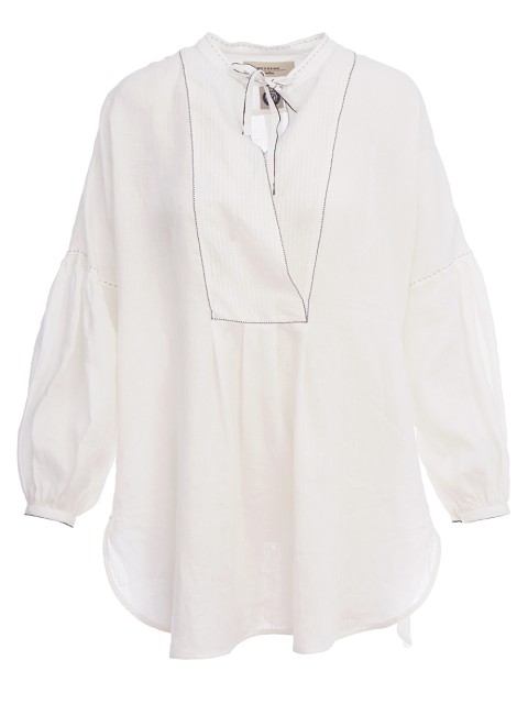 Детали: свободный крой, круглый вырез горловины с завязкой, манишка с мысом в полоску, декорирована контрастным швом, спущенный рукав со сборкой, собран книзу тонкой манжетой. Удлиненная спинка, закругленный нижний край, боковые разрезы, перевернутые складки под манишкой и на спинке.