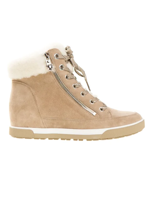 Детали: закруглённый носок, прямая подошва, скрытая танкетка, шнуровка и молния. Утеплитель: мех.