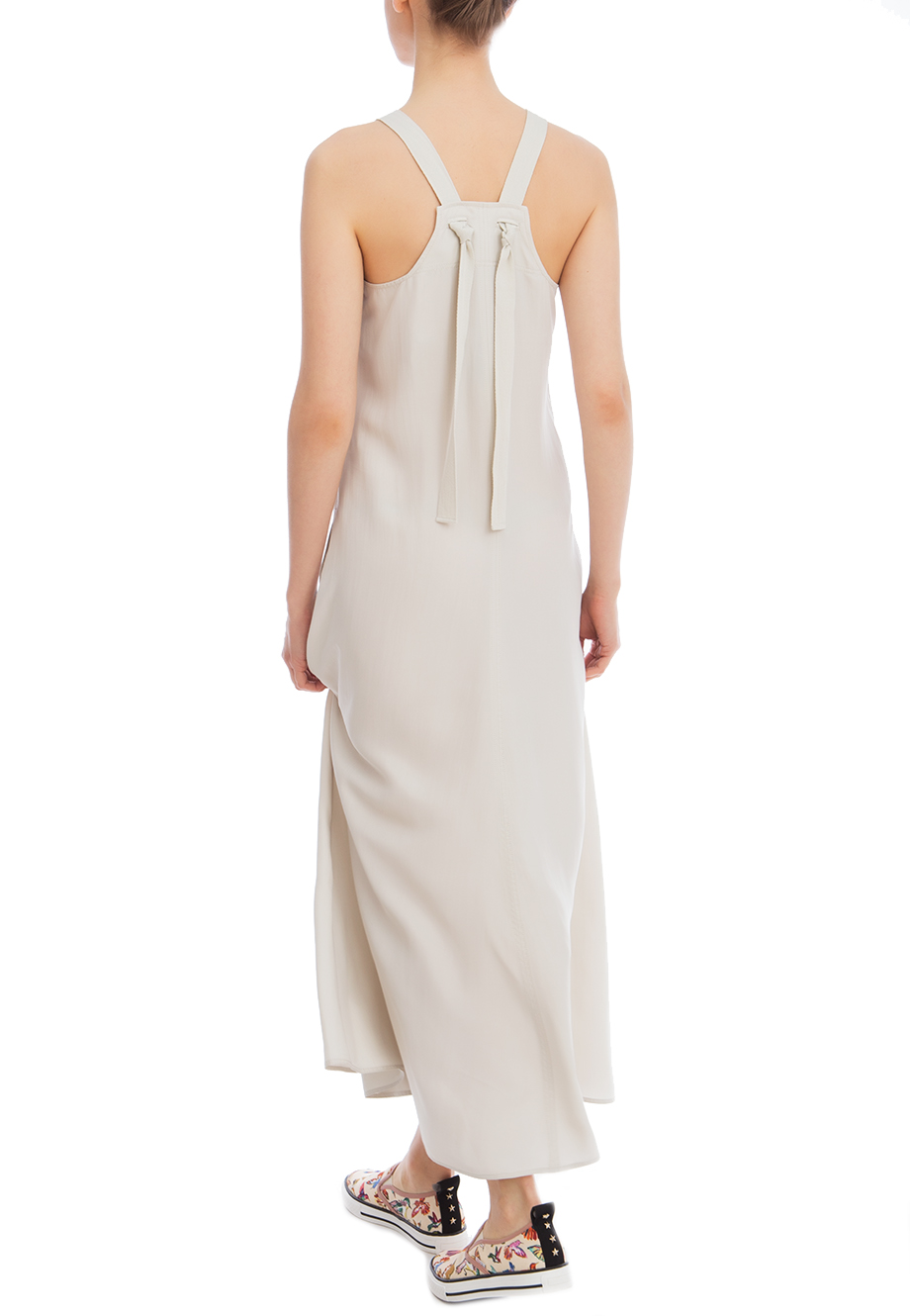 Детали: А-силуэт, американская пройма, репсовые лямки, на спинке крепятся декоративными узлами, по бокам карманы-карго.