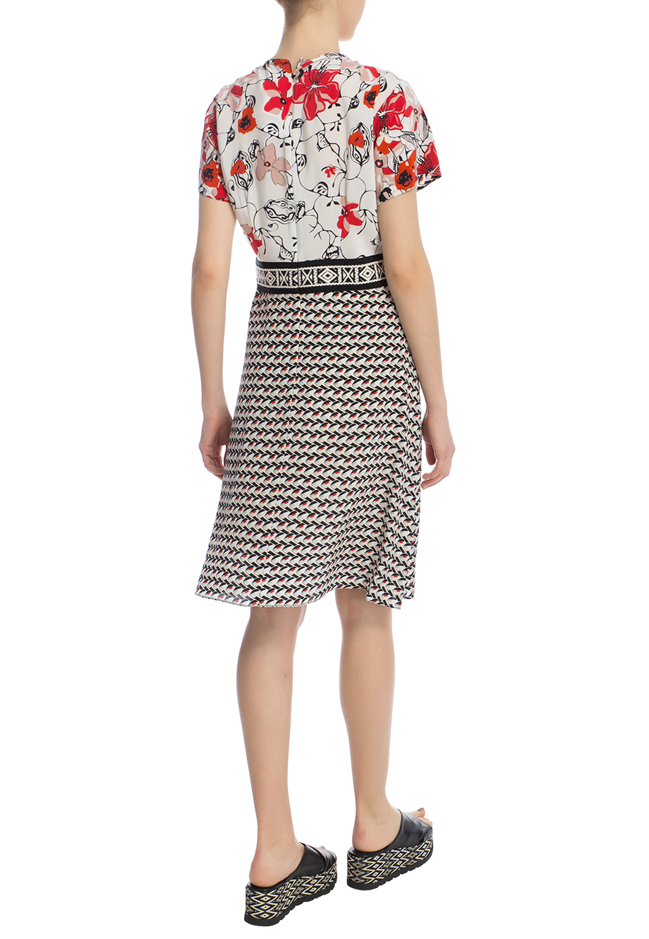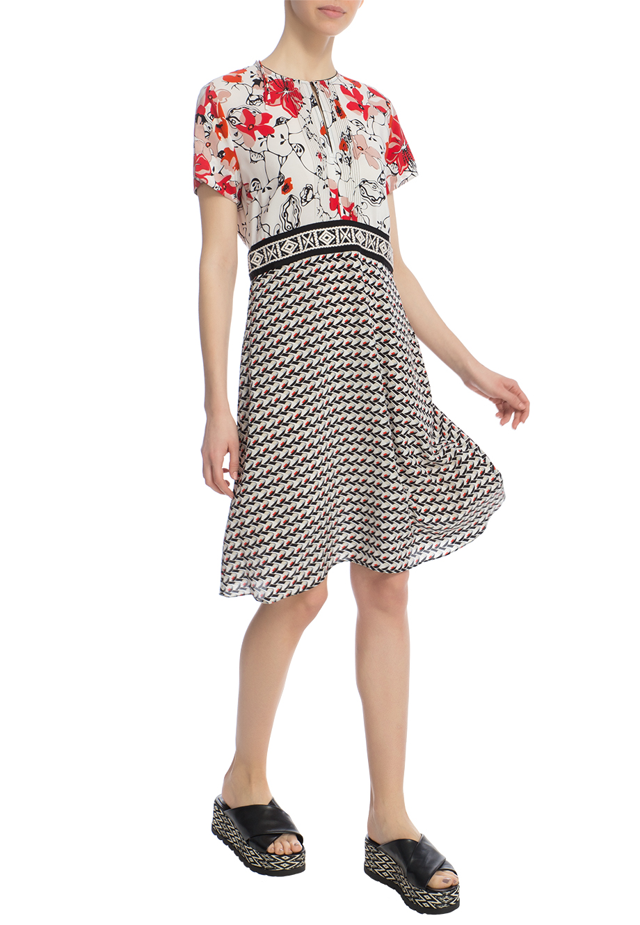 Детали: А-силуэт, круглый вырез горловины с вырезом и пуговицей, короткий втачной рукав, отрезная линия талии с широким вшитым поясом, юбка длиной до колена. Комбинация цветочного принта и орнамента.