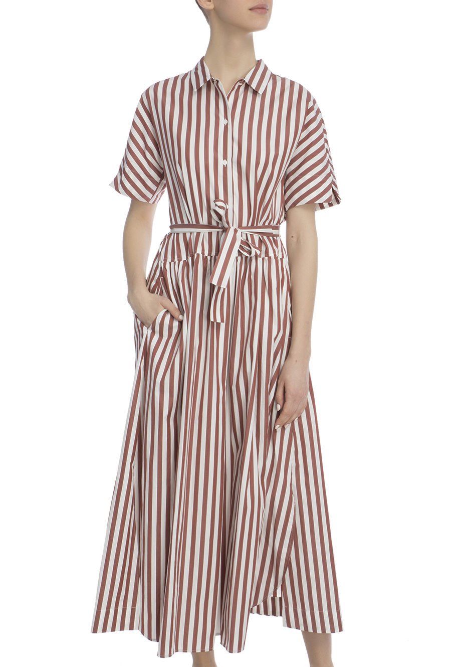 Детали: А-силуэт, отложной воротник с планкой и рядом пуговиц, короткий втачной рукав, отрезная линия талии, юбка с мелкой сборкой, прорезные карманы по боковым швам, пояс.
