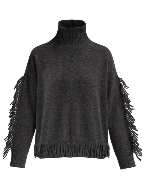 Детали: прямой свободный крой, высокий ворот, спущенный длинный рукав, декоративная бахрома по рукавам и по нижнему краю.