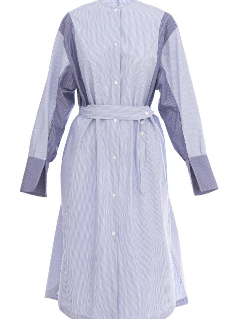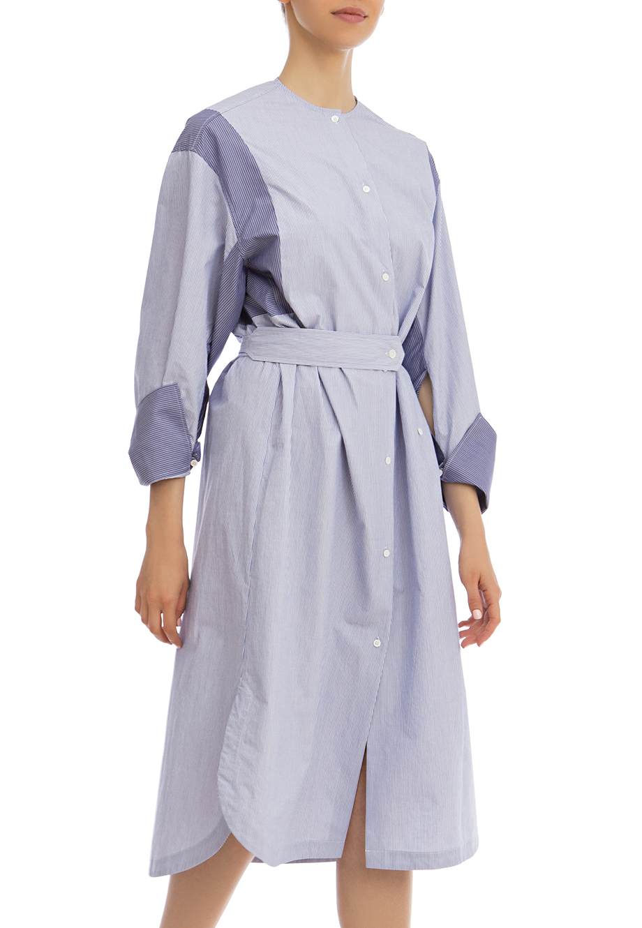 Детали: прямой крой, круглый вырез горловины, длинный втачной рукав с декоративной манжетой в отворот и разрезами. Длина ниже колена, закругленный нижний край с боковыми разрезами. Линия талии выделена текстильным поясом с пуговицей, контрастные вставки по бокам и на рукавах, планка с рядом пуговиц по всей длине.