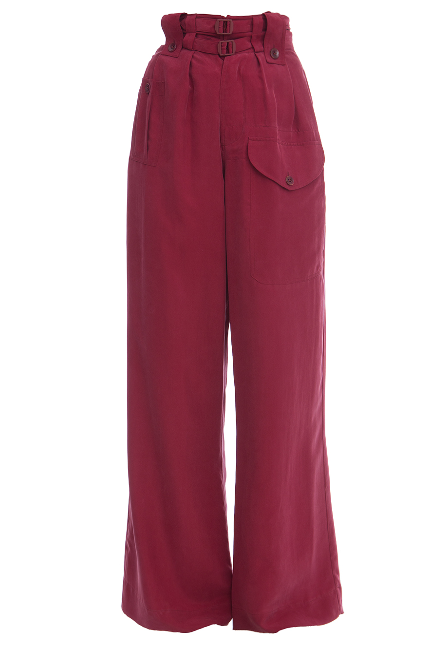 Детали: крой клеш от бедра, высокая посадка, пояс с двойными ремнями на пряжках, прорезные карманы по боковым швам, декоративных накладной карман с клапаном и пуговицей на бедре, сзади два накладных кармана с клапаном на пуговице, на поясе шлевки для ремня, пуговица, ширинка