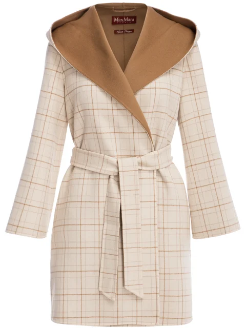 Детали: прямой крой под пояс, ворот с капюшоном, длинный расклешённый рукав, пояс по линии талии, прорезные карманы по боковым швам. Принт в клетку.