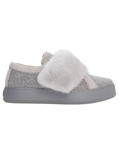 Детали: закруглённый носок, прямая подошва высотой 2 см, отделка кожаным кантом, союзка с отделкой из меха норки.