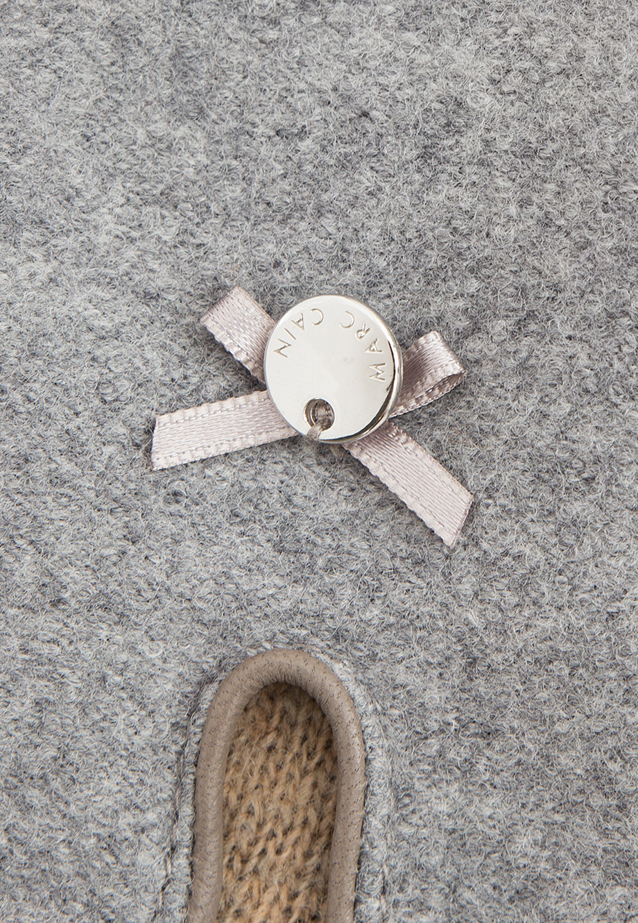 Детали: перчатки из кожи и вязаного полотна, утеплённые шерстью. Декоративный разрез с бантиком на запястье.