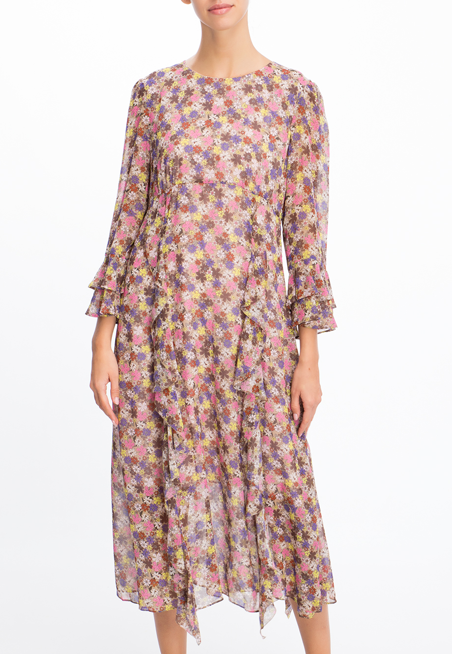 Детали: А-силуэт, круглый вырез горловины, длинный рукав с оборками длиной ⅞, отрезаны линия талию воланы, длина миди.