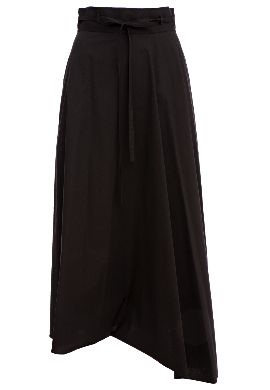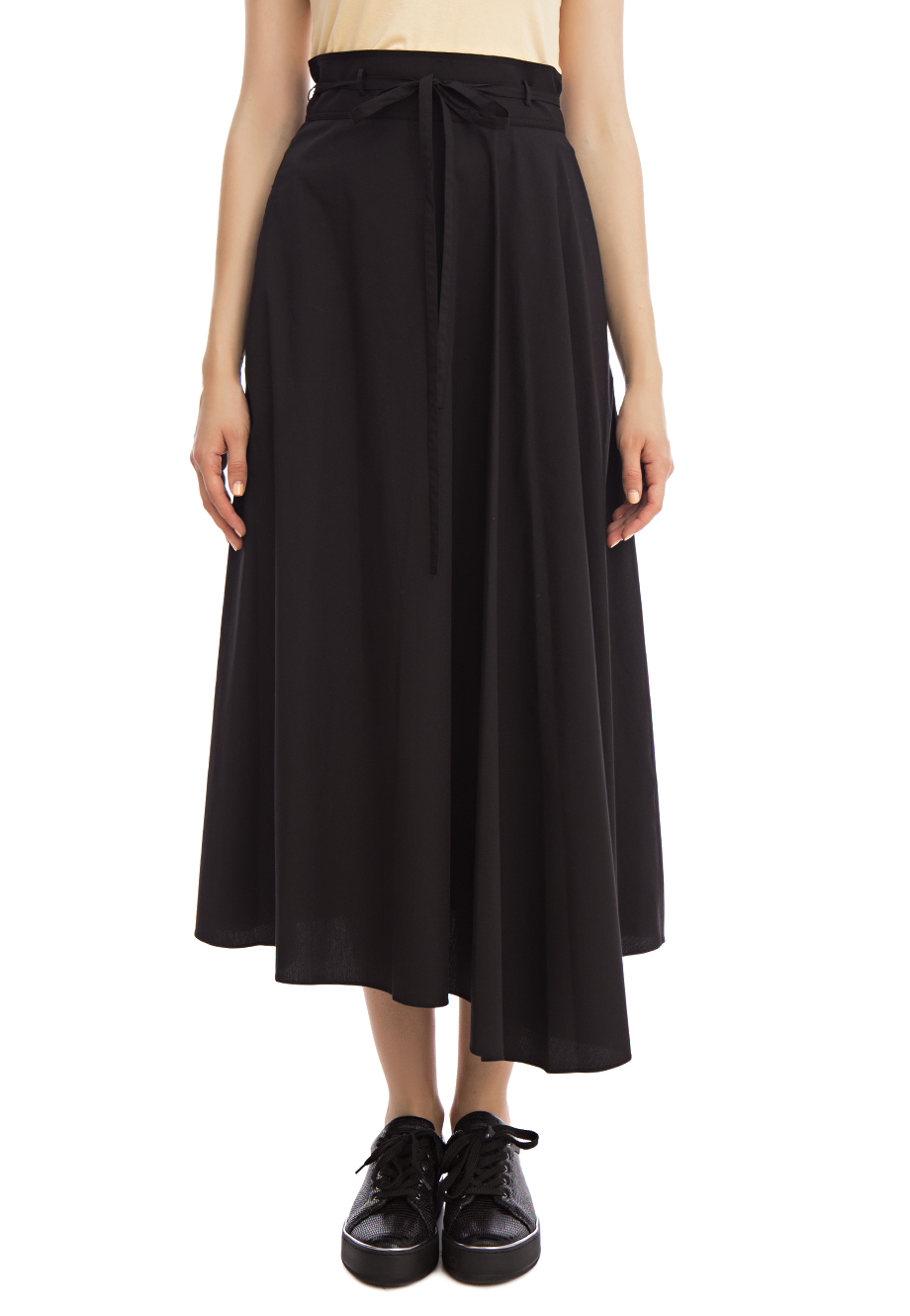 Детали: А-силуэт, высокая посадка, крупная сборка, асимметричный подол, тонкий ленточный пояс в шлёвках. Застёгивается на спинке потайной молнией.
