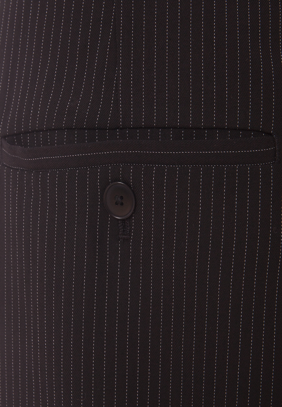 Классические прямые брюки, слегка зауженные книзу. Застегиваются на молнию, пуговицу и крючок, скрытые клапаном. Французские боковые карманы и прорезные, на пуговицах, сзади. Пояс впереди на завязках, есть шлевки для ремня.