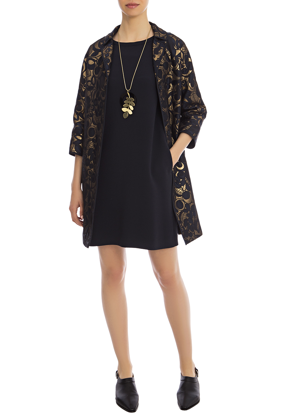 Детали: прямой крой, небольшой отложной воротник с лацканами, втачной рукав длиной ¾, прорезные карманы по боковым швам, контрастный тонкий кант по краю ворота и рукава. Застёгивается потайными кнопками. Флористический узор, подклада из полиэстера.