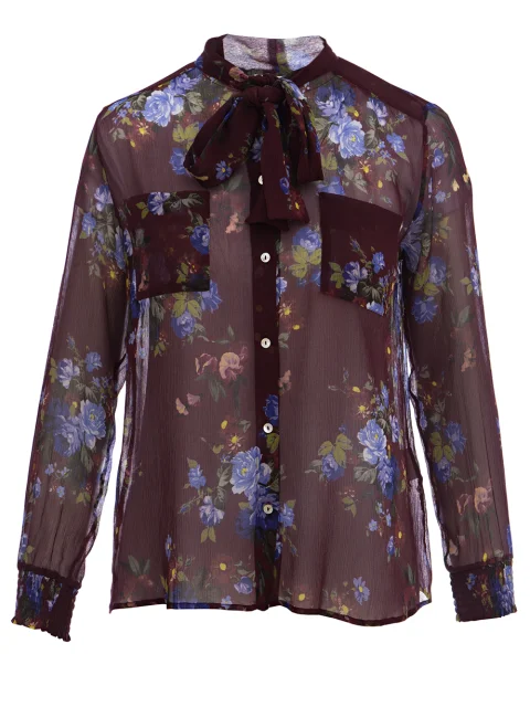 Детали: прямой крой, воротник с завязками, длинный втачной рукав, собранный манжетой на пуговице. Два нагрудных кармана, планка с рядом пуговиц, цветочный паттерн.