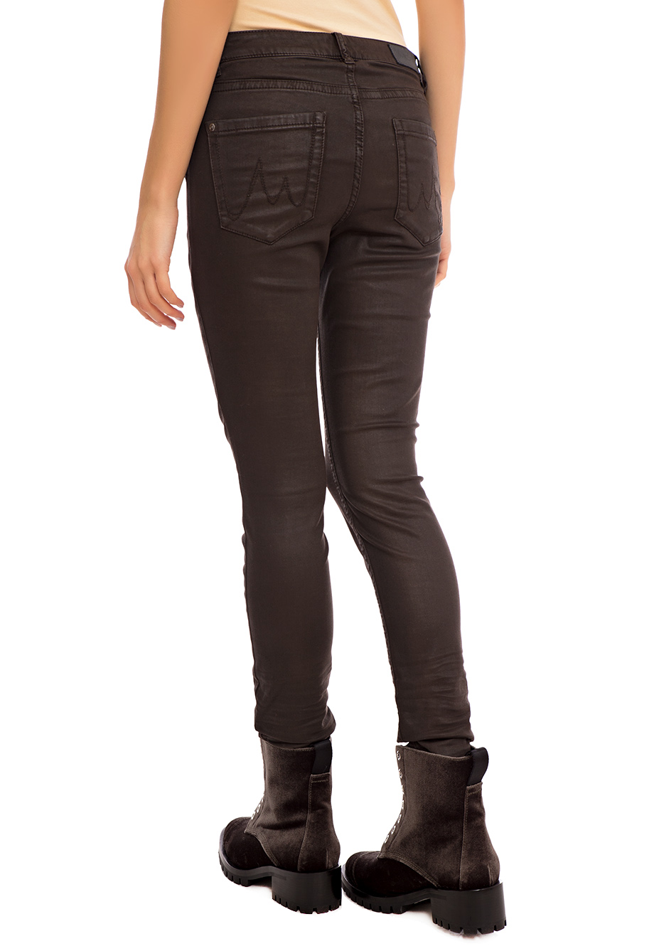 Детали: облегающий крой, средняя посадка, пять традиционных карманов, глянцевая пропитка ткани.