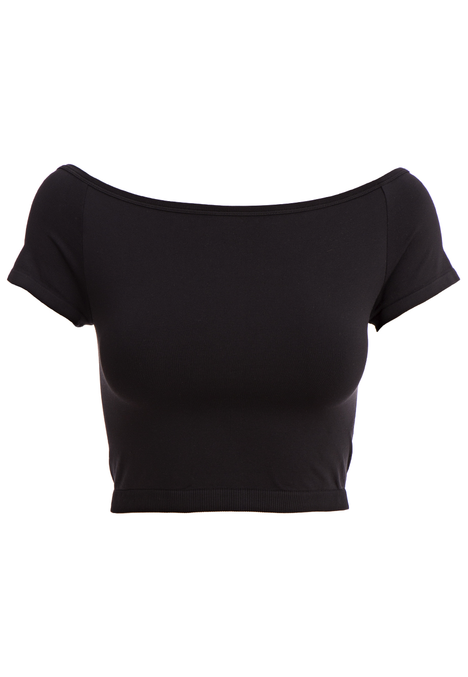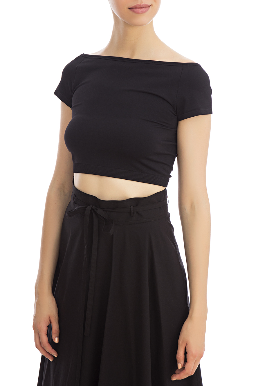 Детали: облегающий укороченный крой, глубокий вырез лодочкой, короткий рукав реглан.