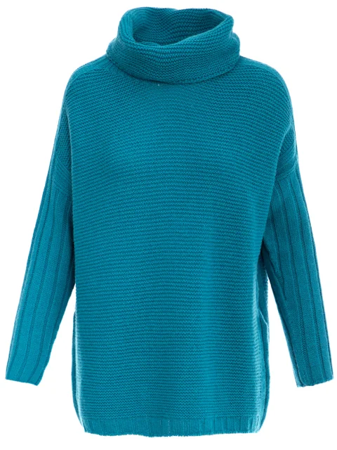 Детали: прямой свободный крой, ворот-хомут с отворотом, спущенный длинный рукав, фактурная вязка.