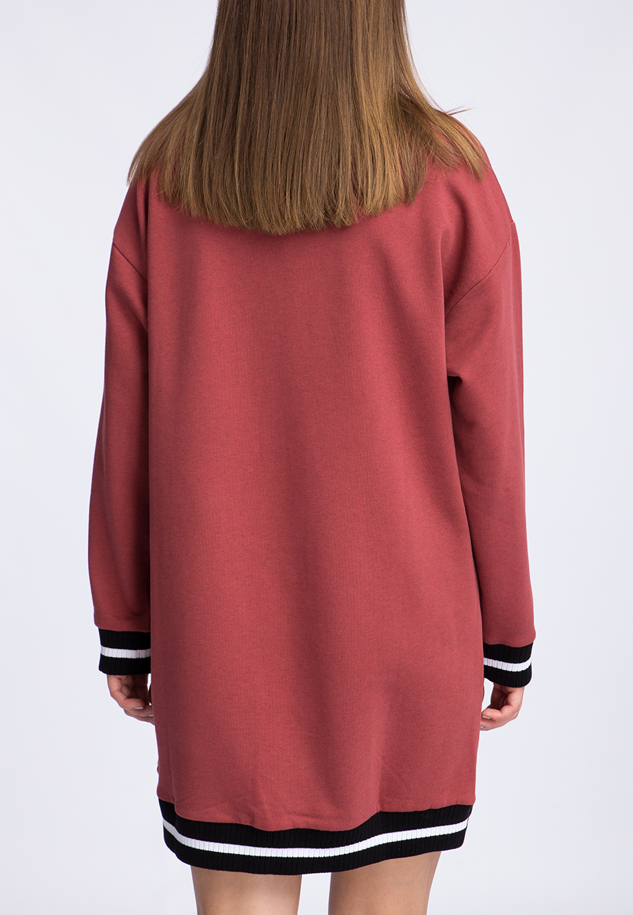 Детали: овальный крой, высокий спортивный ворот с молнией, спущенный длинный рукав, манжеты по нижнему краю и на рукавах, аппликация на груди.