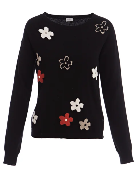 Детали: прямой крой, круглый вырез горловины, длинный втачной рукав, тонкая вязанная резинка по кромке ворота, на рукавах и по нижнему краю. Сбоку ряд декоративных пуговиц. Вязаный рисунок цветами.