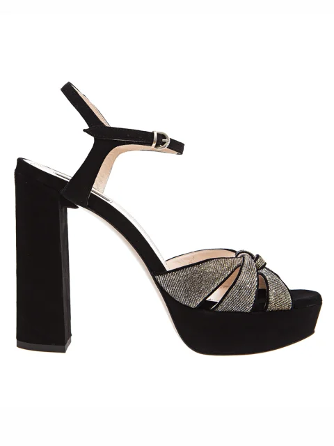 Детали: закруглённый носок, платформа высотой 3 см, каблук высотой 12 см, тройные перепонки с глиттером серебристого и золотистого цветов. Ремешок вокруг прятки с пряжкой и каблук с отделкой из замши. Кожаная стелька.