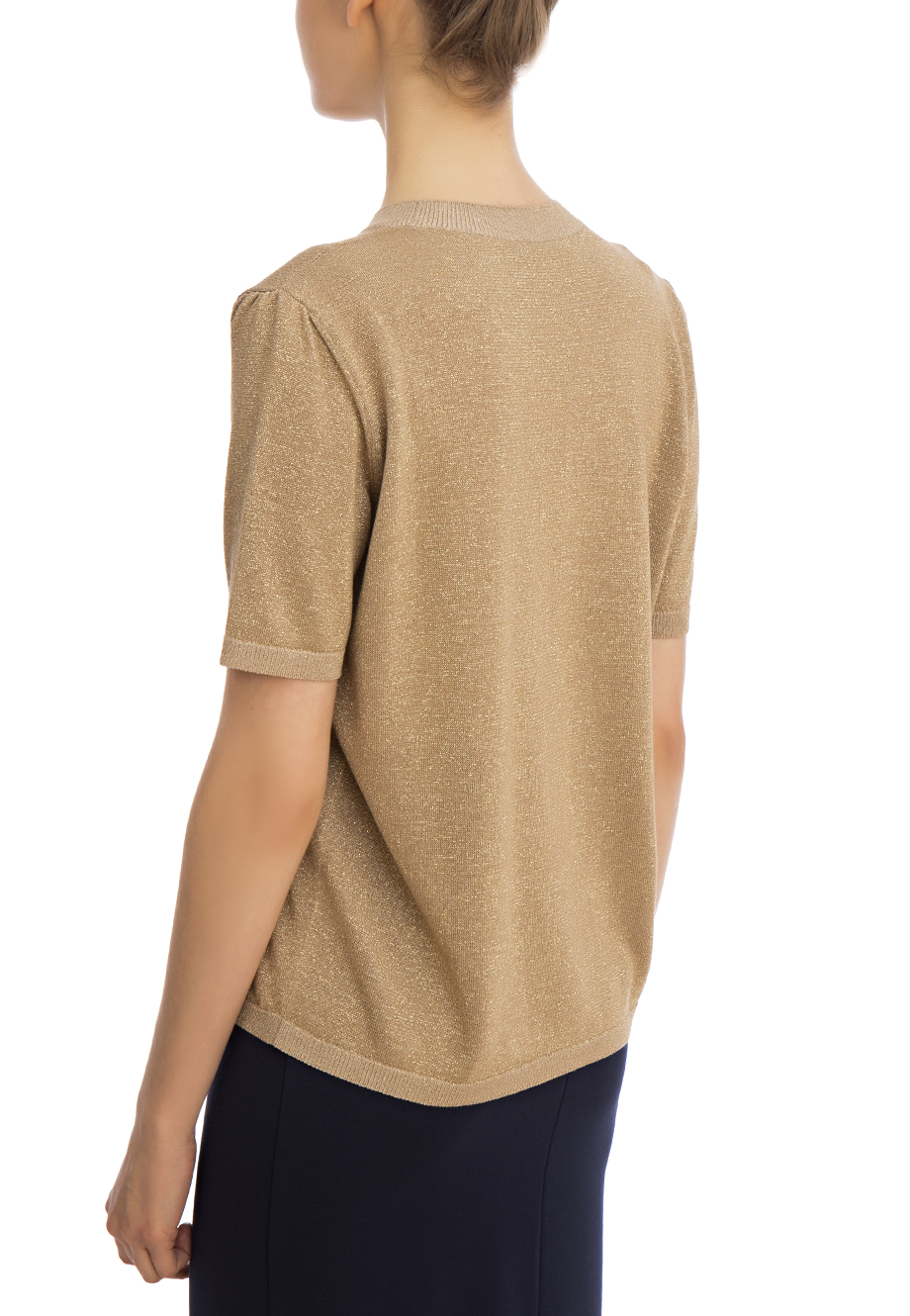 Детали: прямой крой, круглый вырез горловины, короткий рукав-фонарик, свободная резинка по нижнему краю, краю рукава и по канту горловины.