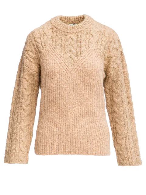Детали: прямой крой, круглый вырез горловины, спущенный длинный рукав, фактурная пряжа, вязаный узор.