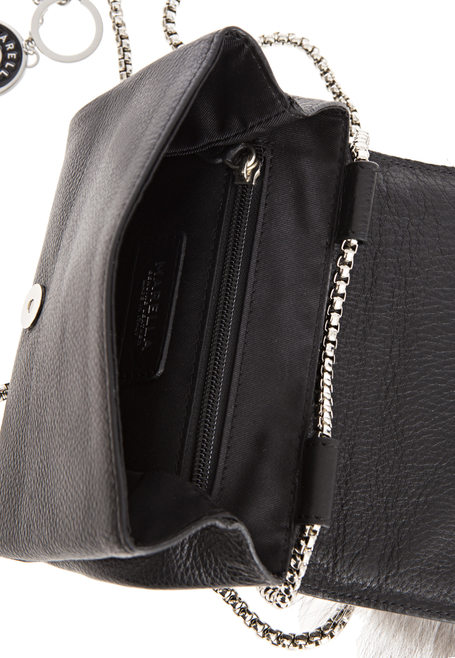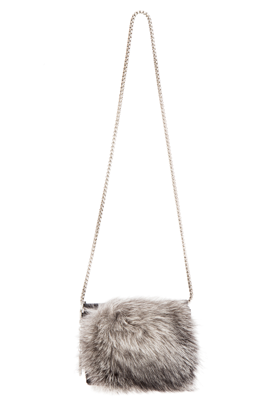 Детали: прямоугольная форма, крышка клапан декорирована лисьим мехом, гладкая глянцевая кожа, вместительно отделение с кармашком на молнии. Плечевой ремень в виде цепочки. Магнитный механизм застежки, фирменный брелок-подвеска.