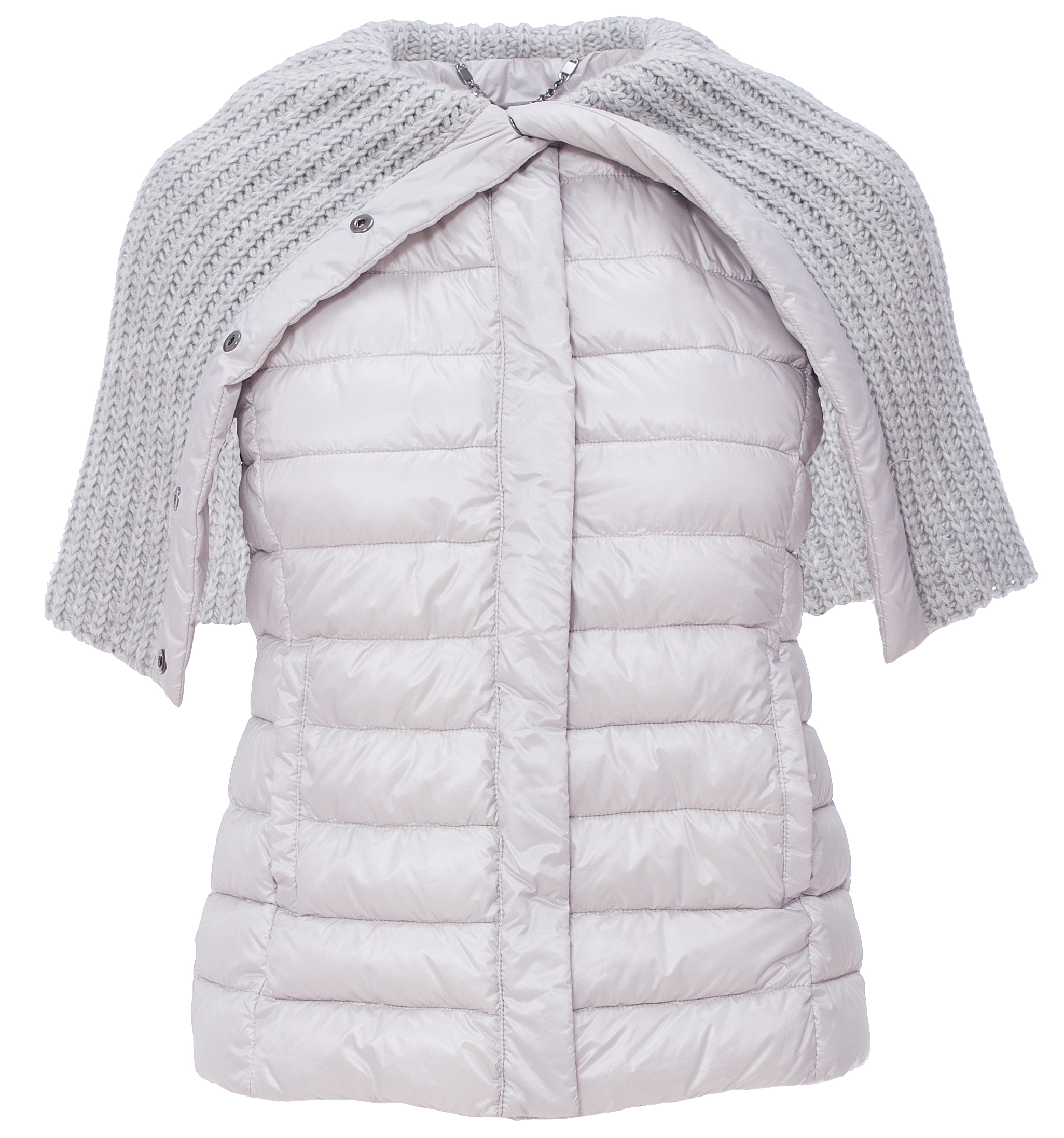 Детали: прямой крой мягкое шерстяное сукно, круглый вырез горловины, длина до бедер, два прорезных горизонтальных кармана, рукава длиной 7/8 слегка расклешенные к низу, застегивается на потайные кнопки; в комплекте идёт пуховый жилет с объёмным вязаным отложным воротом с застёжкой молнией и прорезными карманами по бокам.