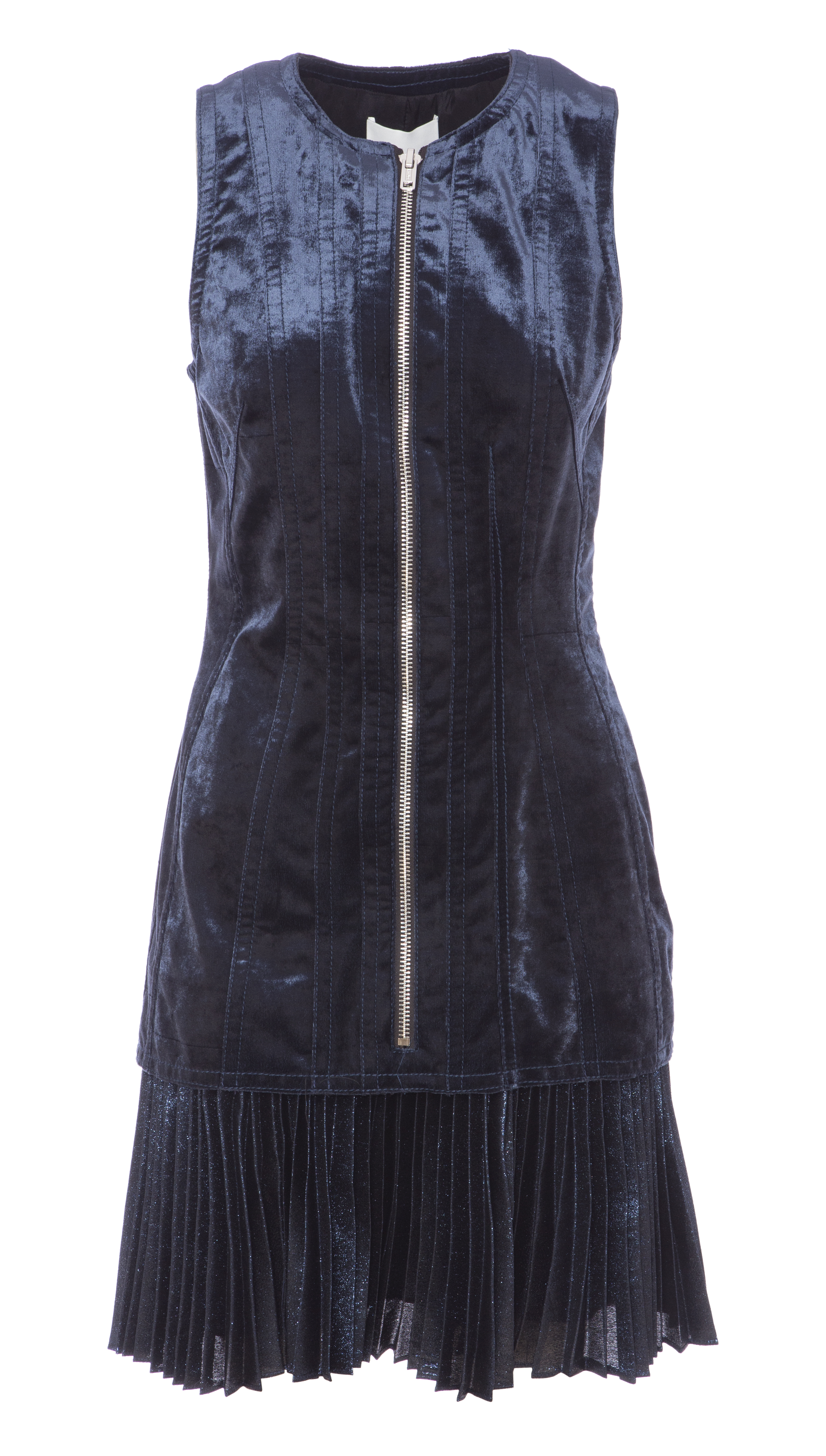 Детали: силуэт прилегающий к фигуре, заниженная отрезная линия талии, юбка с плиссировкой длиной до середины бедра. Круглый вырез горловины, без рукавов. Декоративная металлическая молния вдоль платья спереди.