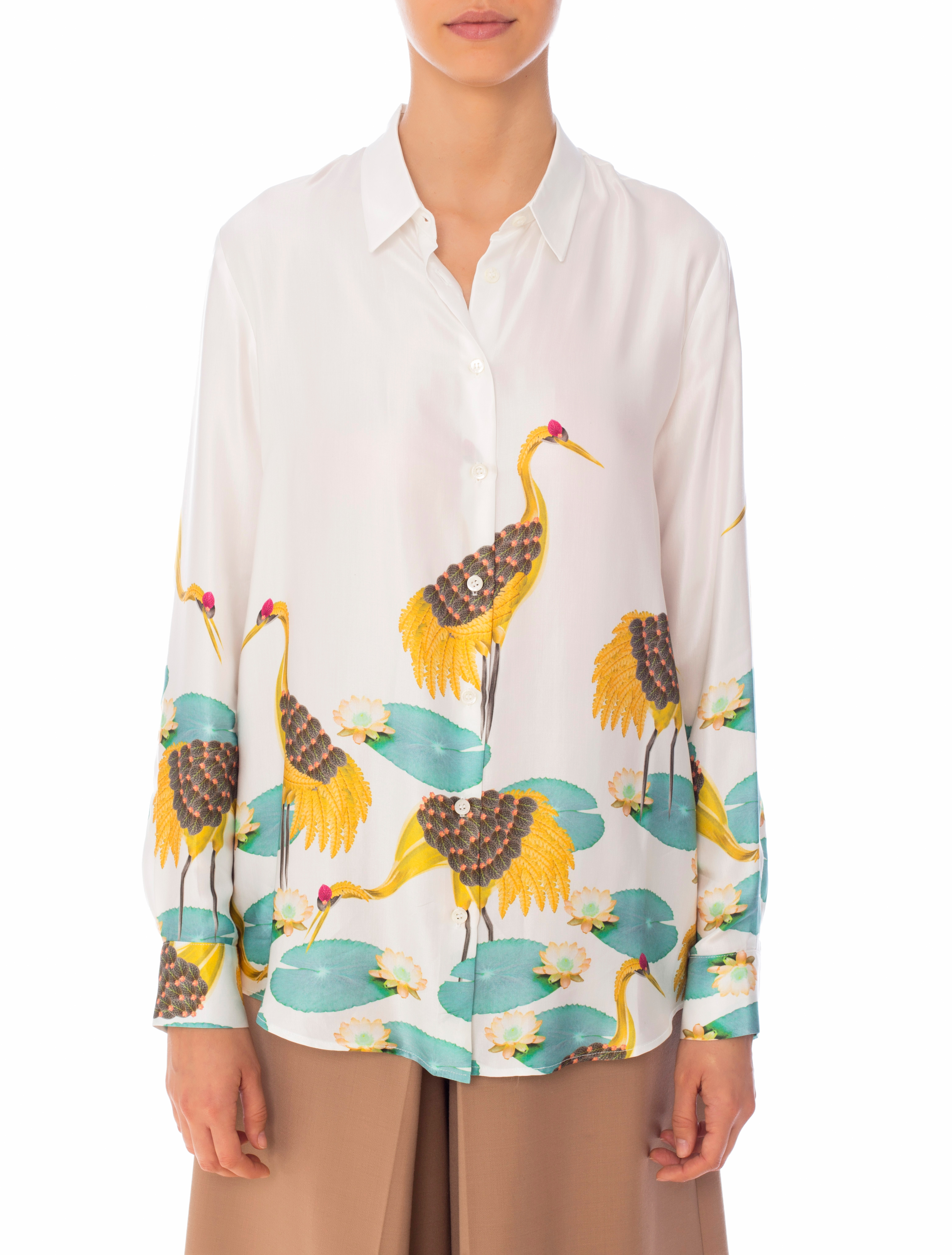 Детали: прямой свободный крой, отложной воротник, длинный рукав собранный манжетом, планка с рядом пуговиц, сюжетный рисунок птиц на пруду.