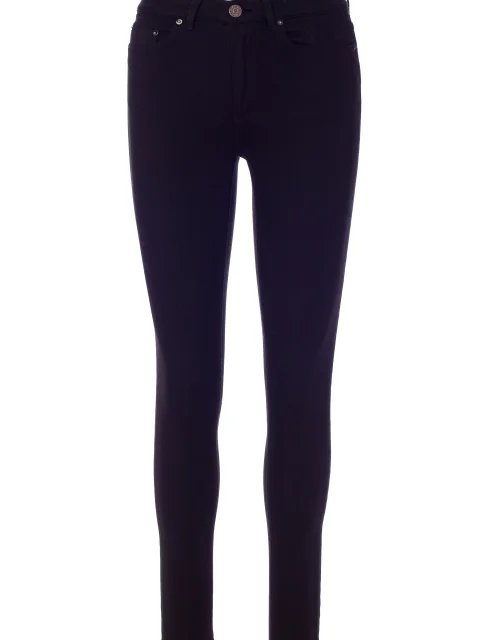 Детали: облегающий крой, высокая посадка, пять классических карманов, пояс с пуговицей и шлевками для ремня, ширинка.